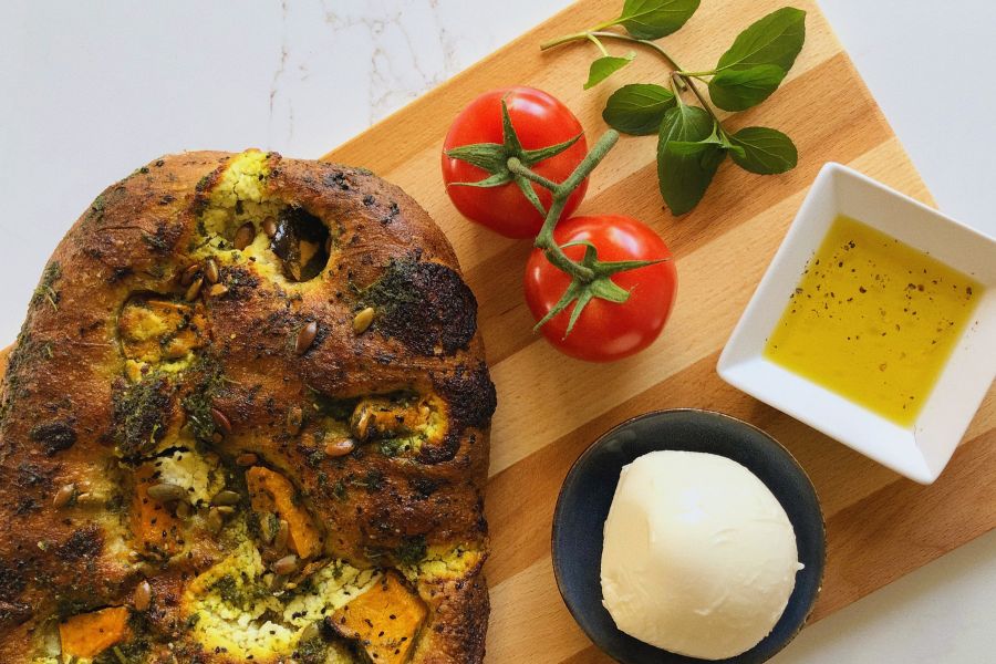 I like my focaccia to be warm and crunchy, so I usually throw mine back into a preheated oven (approx. 180 degrees C) for about 10-15 minutes. You can definitely eat it fresh, but I’d recommend heating it a little if it’s a day old.