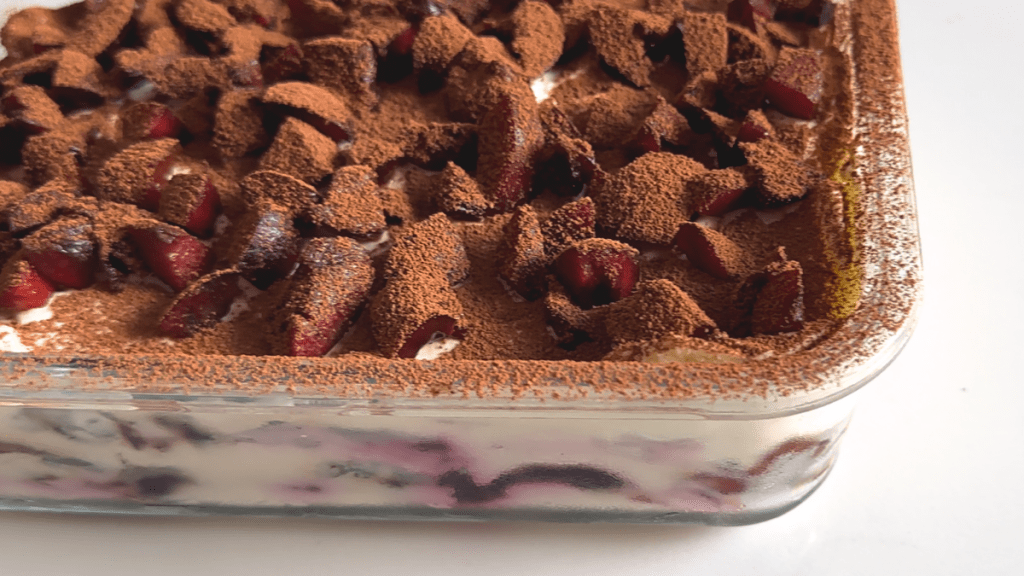 Step 7: Toppings before serving. Take your cake out of the fridge, and test if it’s ready by sticking a small knife toothpick into the cake. If it’s nice and soft, it’s ready! Scatter a layer of fresh cherry pieces over the top and dust with cocoa or cacao powder.