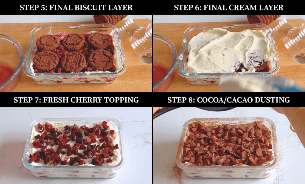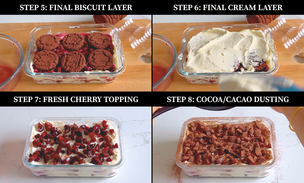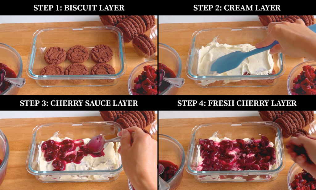 Step 5: Assemble the cake. This is the fun part! Start by layering the Choc Ripple biscuits at the bottom, then cover the biscuits with some whipped cream. Add the cherry sauce and sprinkle some fresh cherry pieces all over. Repeat the sequence again.
