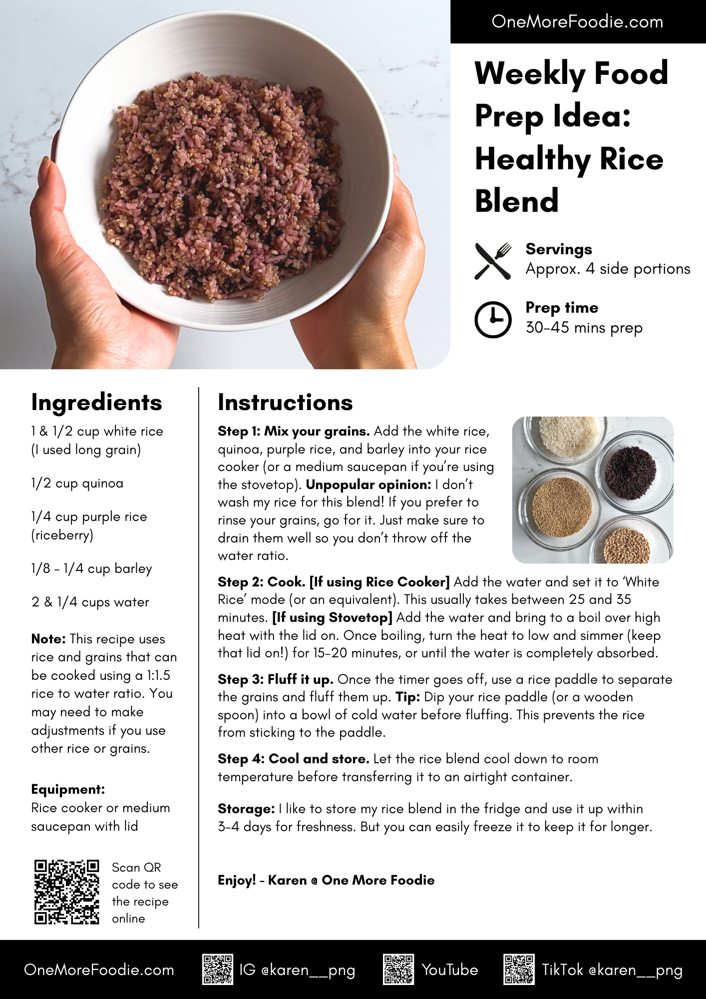 While full meal prepping can feel repetitive or boring, prepping your base ingredients gives you so much more flexibility! Today we’re going to make my go-to healthy rice blend using white rice, quinoa, purple rice and barley.