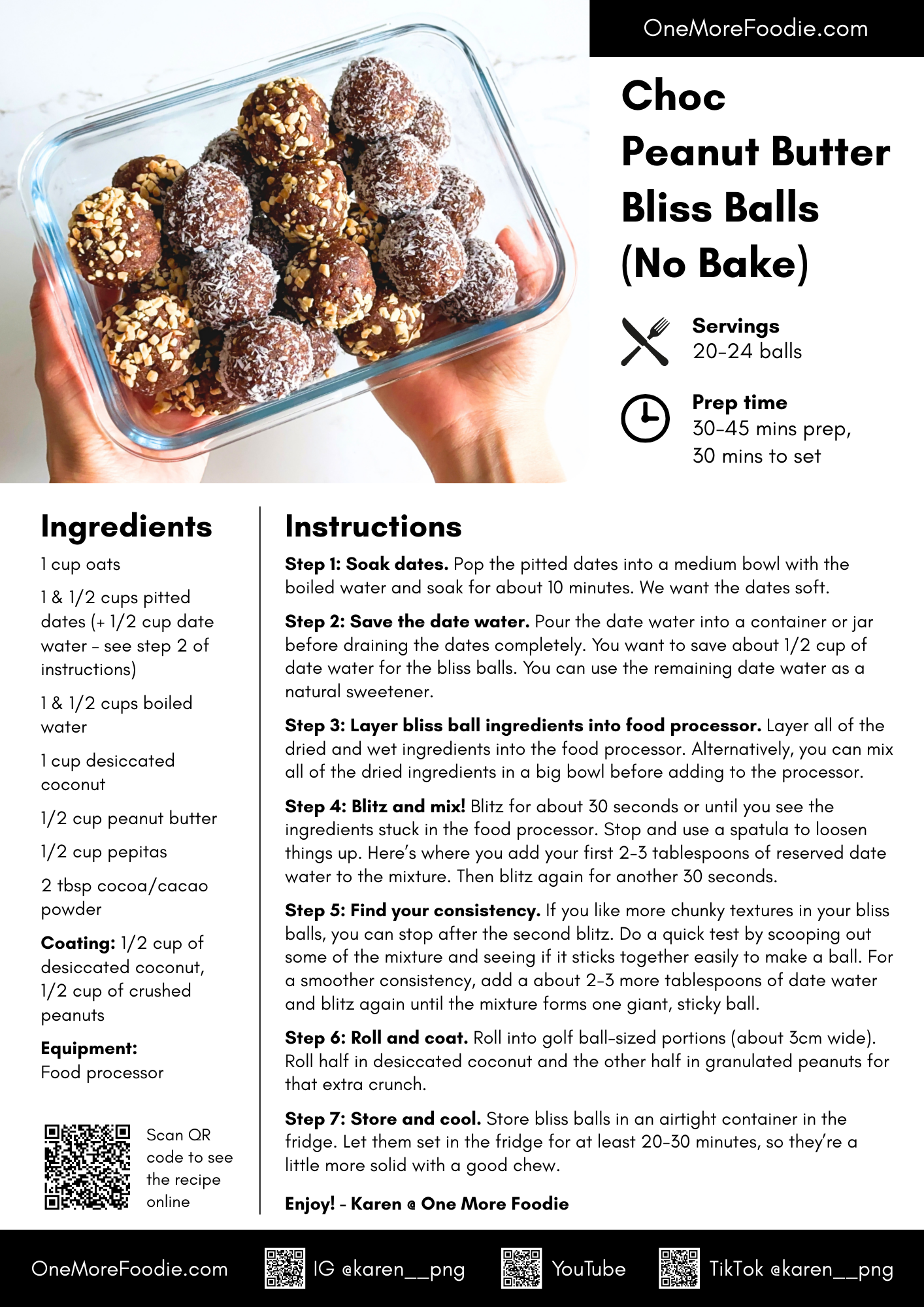 Prep & cook time: Approx. 30-45 minutes. I’m pretty fast at rolling the bliss balls now, but take your time if it’s your first time making these. Here’s a quick breakdown: