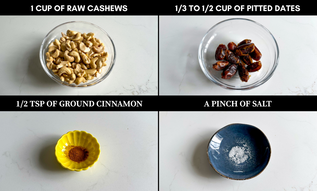 - 1 hour for soaking cashews and dates;