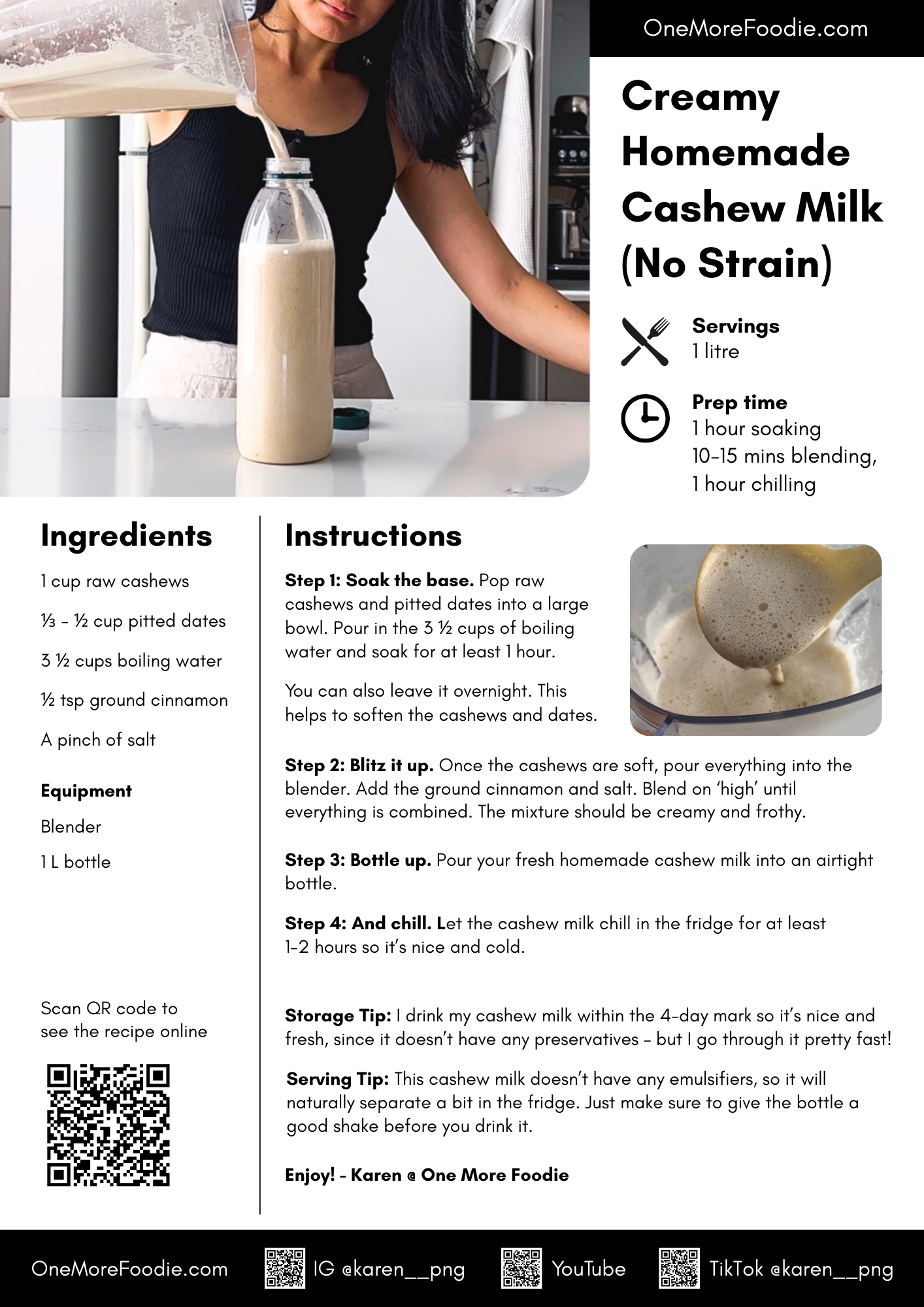 Servings: This recipe yields just over 1L of cashew milk.